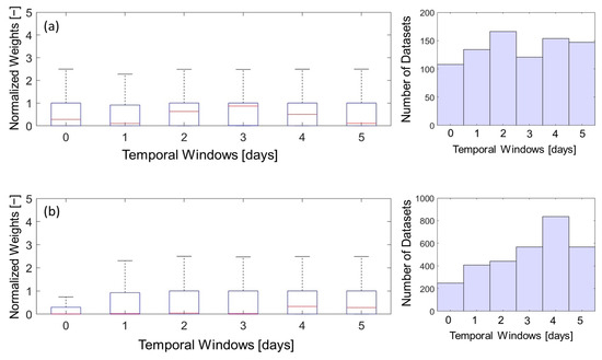 Boxplot of weight depending on different temporal windows for (a) Lake Erie and (b) other inland lakes across Ohio.