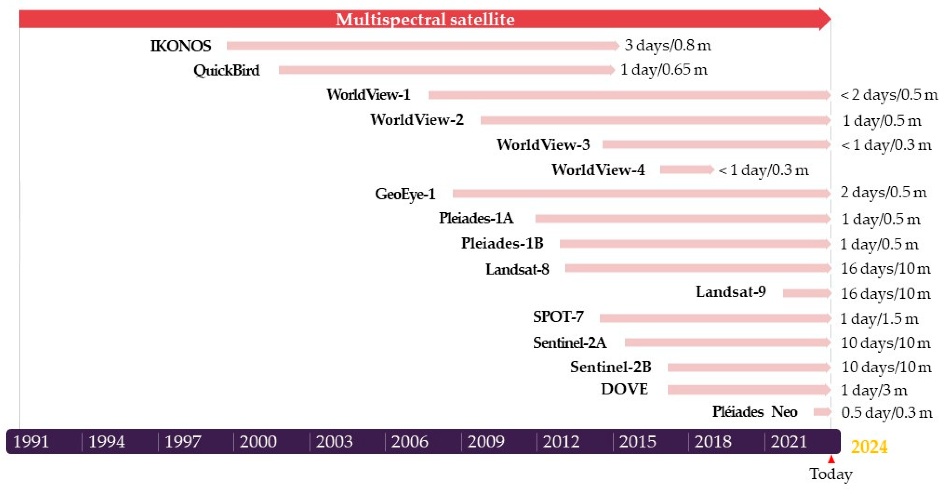 | Multispectral/Hyperspectral images | Multispectral satellite sensor | Sentinel-2 | 10/20/60 * m | 100 × 100 km |