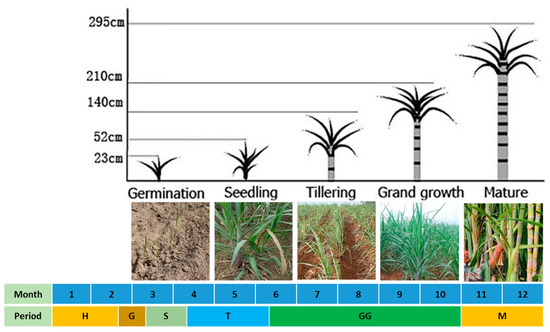 Sugarcane is an annual irrigated crop with five major growth periods in the life cycle: germination, seedling growth, tillering, grand growth, and mature period [33,36]. In Suixi County, for most sugarcanes, the germination and seedling growth periods are between late February and early April. The tillering period starts usually in early April and lasts until late May. Sugarcane starts to elongate its stem and grow rapidly between June and October in the grand growth period [37]. The mature period lasts from October to early December, and the harvest begins in late December and lasts until March of the following year [38]. Details of the five growth periods are shown in Figure 2.