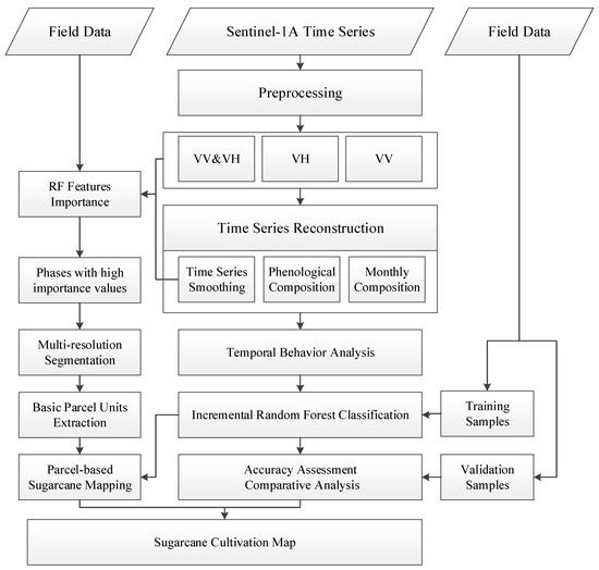 First, the time-series smoothing technique and phenology/month-based image compositing approaches were utilized to reconstruct the time-series Sentinel-1A data, based on which the temporal behaviors of sugarcane and other vegetation types were analyzed. Next, using the incremental random forest classifier, the performance of the time-series Sentinel-1A data in sugarcane mapping was assessed for different reconstruction techniques, polarizations, and time ranges. Then, the mean decrease in accuracy (MDA) was used to evaluate the feature importance of each time phase and each polarization mode for sugarcane cultivation discrimination. After that, the phases with high-importance values were selected, and basic parcel units were extracted based on multi-resolution segmentation. At last, the parcel-based classification method, combining time series smoothing SAR data, RF classifier, and basic parcel units, was used to generate a sugarcane extent map.