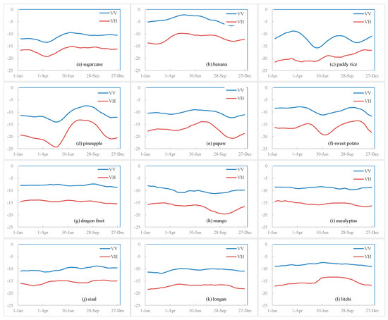 The temporal profiles of sugarcane and other 11 typical vegetations were plotted based on the Sentinel-1A backscattering coefficient ( in dB), as shown in Figure 4. The blue and orange curves represent the VV and VH polarization, respectively. The 11 typical vegetations included banana, paddy rice, pineapple, papaw, sweet potato, dragon fruit, mango, eucalyptus, sisal, longan, and litchi. It should be noted that the curves in Figure 4 were based on the LOESS filter of Sentinel-1A data rather than the original data.