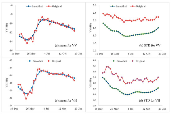 Comparison of LOESS-smoothed and original Sentinel-1A time series data. (a) Mean for VV polarization; (b) standard deviation for VV polarization; (c) mean for VH polarization; (d) standard deviation for VH polarization.