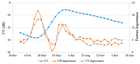 Figure 6 shows the feature importance for the sugarcane discrimination that employed both VV and VH polarizations. The blue curve was the standard sugarcane temporal profile of the LOESS-smoothed VV polarization in Figure 5a. The orange and gray curves demonstrated the feature importance of each temporal for VH and VV polarizations, respectively. The temporal feature importance of the VH and VV polarizations were similar. There was no significant difference between VV and VH polarizations. Their correlation coefficient was as high as 0.89. Although the VH polarization on 12 March obtained the highest importance score, it was hard to draw a conclusion about which polarization was better for sugarcane identification. The most important phase was on 12 March. For VH and VV polarizations, the feature importance was 20.04 and 15.97, respectively. The second most important phase was on 4 June. For VH and VV polarizations, the feature importance was 13.39 and 13.05, respectively. The tillering period (from late March to late May) and grand growth period (from June to October) showed low importance values.