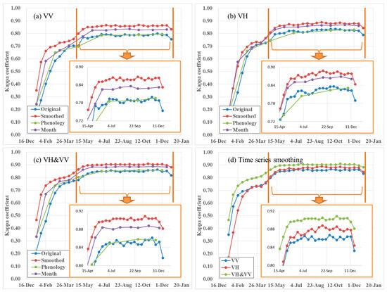 Figure 7 shows the sugarcane mapping Kappa coefficient with the incremental image acquisition date based on VV polarization (Figure 7a), VH polarization (Figure 7b), and VH&VV (Figure 7c), respectively. In these three sub-figures, four kinds of time series reconstruction methods were compared: (1) original time series data (blue); (2) smoothed time series data with LOESS filter (red); (3) phenology-based compositing data (green); and (4) monthly based compositing data (purple). Figure 7d shows the comparison of different polarization modes based on smoothed time series data. To clearly show the difference between them, the data between April and December were enlarged at the lower right corner of each sub-figure.