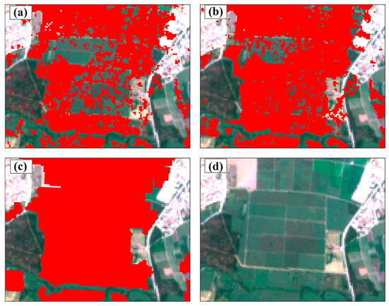 Comparison of the sugarcane mapping results for ROI 3. (a) Pixel-based using original time series data; (b) pixel-based using smoothed time series data; (c) parcel-based using smoothed time series data; (d) Sentinel-2 RGB composite image.