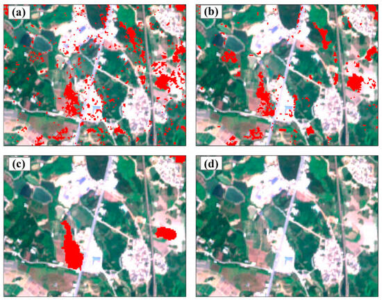 Comparison of the sugarcane mapping results for ROI 2. (a) Pixel-based using original time series data; (b) pixel-based using smoothed time series data; (c) parcel-based using smoothed time series data; (d) Sentinel-2 RGB composite image.