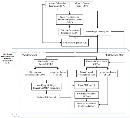 A diagram of the proposed method is illustrated in Figure 1. In addition, the inputs and outputs of each step of the proposed method are provided in Table 1. The proposed method consists of two general steps. In the first step, the MLP network is trained using Simulated Control Points (SCOPs) to establish the relation between the object/ground and image spaces. In the second step, the model is evaluated using Simulated Check Points (SCPs), as arbitrary ground points, through the transformation from the ground space to the image space and determination the corresponding best scanlines. More details of the proposed method will be provided in Section 2.4.