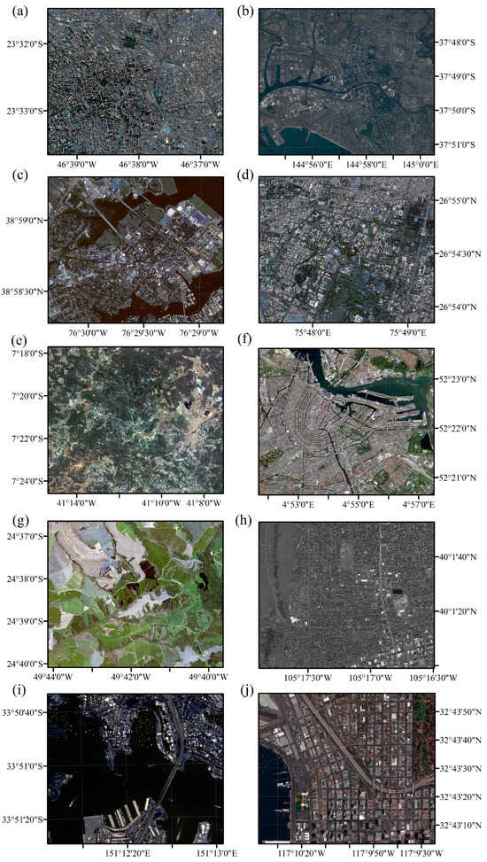 Linear array pushbroom images used to evaluate the proposed BSD method, including (a) IKONOS image from Sao Paulo, Brazil, (b) Pleaides 1A image from Melbourne, Australia, (c) Pleaides 1B image from Annapolis, USA, (d) QuickBird image from Jaipur, India, (e) SPOT6 image from Jaicos, Brazil, (f) SPOT7 image from Amsterdam, Netherland, (g) SPOT7 image from Curitiba, Brazil, (h) WorldView1 image from Boulder, USA, (i) WorldView2 image from Sydney, Australia, and (j) WorldView2 image from SanDiego, USA.