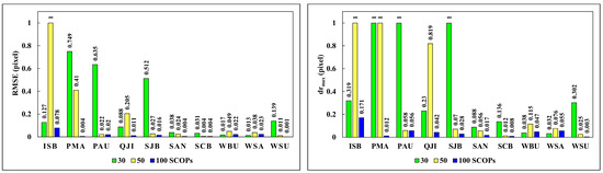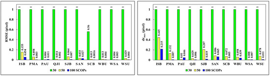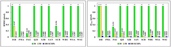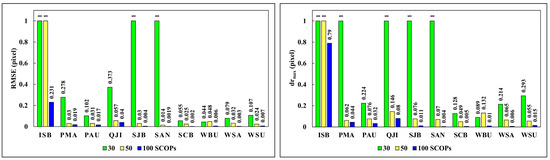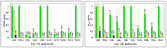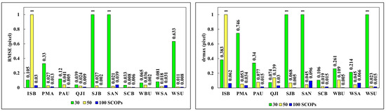 The results of the MLP models with one layer and five-to-ten neurons for all the images are shown in Figure 3, Figure 4, Figure 5, Figure 6, Figure 7 and Figure 8. Generally, the results indicated that the number of neurons had no significant effect on the RMSE and drmax values, considering the cases that achieved sub-pixel accuracies. To evaluate the performance of the BSD method, five SCOPs sets with 10, 20, 30, 50, and 100 simulated points and five million SCPs per image were used. However, the SCOPs sets with 10 and 20 simulated points failed to establish a transformation between object and image spaces with sub-pixel accuracy, so their results were excluded. This suggests that a limited number of SCOPs cannot be used to relate object and image spaces, even with shallow MLP models. According to the results, even 30 SCOPs were not enough for object-to-image transformation with the desired accuracy. For some images, the obtained RMSE and drmax values were higher than one pixel, which were mapped to one for better representation. When using an MLP with a 5-neuron structure and 30 SCOPs, the ISB, SJB, and SAN images had RMSE values higher than one pixel. This may be due to the lower spatial resolution of these images compared to others. However, the land cover in these images varies, including urban, flat, and mixed areas, so the accuracy is not solely dependent on the land cover. Increasing the number of SCOPs to 100 resolved this issue, providing sub-pixel accuracy in all images. In the case of a 6-neuron structure with 30 or 50 SCOPs, the drmax values of ISB, PMA, PAU, and SJB images were more than one pixel, but using 100 SCOPs achieved the desired sub-pixel accuracy.