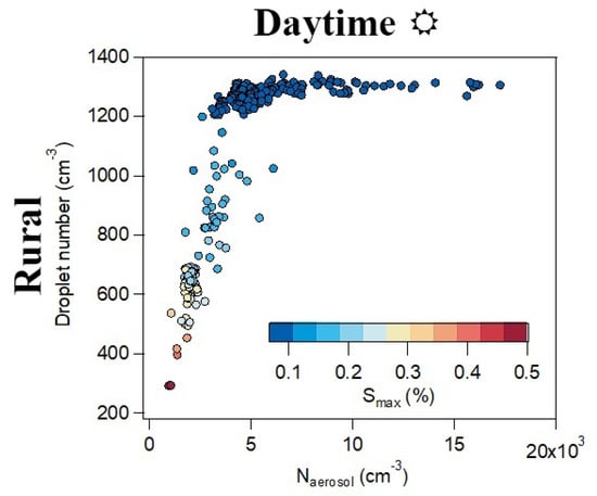 Cloud droplet number vs. total aerosol number. Data are colored by maximum supersaturation. (Figure and caption from Figure 4 in Bougiatioti et al. [30], licensed under CC BY 4.0).