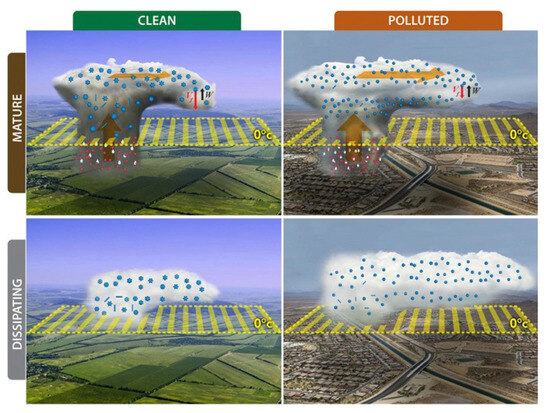 The depression of warm rain, and consequently, higher ice water content, may impact the formation of snow, graupel, and hail and enhance cloud electrification [55] and precipitation rates [56]. The formation of snow, graupel, and hail, along with the cold rain resulting from their melting, is influenced by the dynamic and thermodynamic structures of the clouds and the availability of giant cloud condensation nuclei CCN and INPs [57]. Smaller and narrower cloud droplet sizes and distribution, supercooled liquid water at greater altitude, enhanced cold rain and larger hail, higher cloud tops and stronger updrafts are effects clearly discernible at the scale of the single cloud. Figure 3 from Fan et al. [58] illustrates how an increase in aerosol in polluted environments is reflected in the increase in cloud-top height, cloudiness, and cloud thickness. Convective cores release a significant amount of smaller cloud ice particles, resulting in the extensive spread and prolonged dissipation of anvil clouds, as these smaller ice crystals fall more slowly.