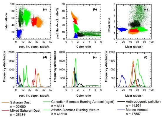 Characteristic lidar quantities of various atmospheric aerosol types (a–c) with frequency distributions (d–f), as well as the total number of measurement points (n) for each aerosol type. Each point in (d–f) represents a single lidar observation. (Figure and caption from Figure 5 in Groß et al. [93] licensed under CC BY 3.0).