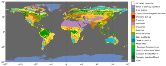 This study utilized the International Geosphere Biosphere Programme (IGBP) land classification dataset. This product covers a valid timeframe of 2001–2022 with a spatial resolution of 0.05° × 0.05° and a temporal resolution of 1 year. As shown in Figure 1, we selected 17 IGBP categories representing different vegetation distributions in 2021 and used this dataset to facilitate the validation of the proposed modeling algorithm’s ability to perform VWC retrieval on different vegetation covers.