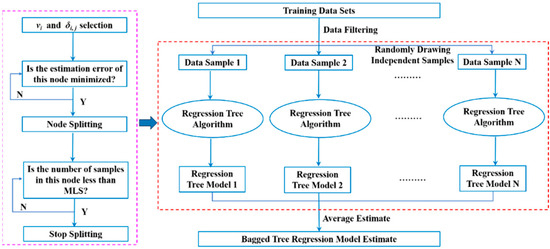 BT is one of the most popular ensemble algorithms based on the concepts of bootstrapping and aggregation. Figure 2 shows the BT algorithm process. In bagging, the training set is randomly sampled times and replaced to generate training sets of the same size as the original training set. It extracts the training set from the original data and uses bootstrapping to randomly select a certain number of training samples from the initial sample set of each cycle [74]. We generate a large number of comparable datasets through resampling and replacement and generate a regression tree without pruning and averaging, resulting in a decrease in the RMSE of the model [75]. In this article, , and we use training set data samples to construct the model, where the is defined as follows: