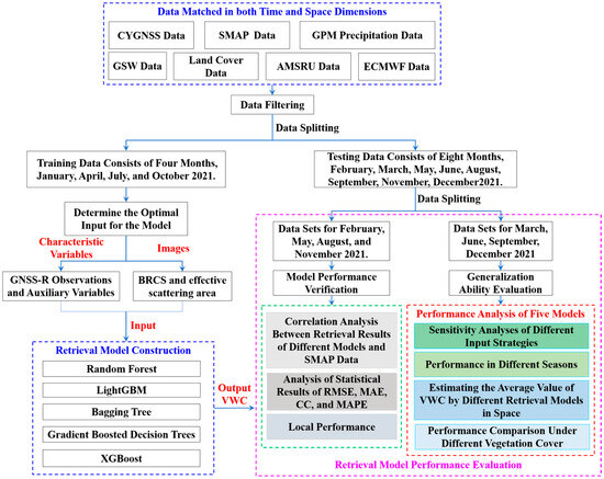 This section thoroughly analyzes VWC retrieval models to assess the applicability and universality of the five ML algorithms (e.g., BT, GBDT, XGBoost, RF, and LightGBM) introduced in this study. To verify the generalization capability of various retrieval methods on unseen data, we utilize SMAP auxiliary data from MODIS products for training and testing. In our study, we selected 4 months (accounting for about 33.3% of the total samples) of the data for training and 8 months (accounting for about 66.7% of the total samples) of the data for testing in consideration of model fitting performance and model retrieval performance. This ratio was determined as a trade-off between the need to have a training dataset sufficiently representative of the behavior of the overall data and the need to keep the computational time for the network determination acceptable. We divided the test dataset into two parts: the first part was used to cross-validate the retrieval performance of the five constructed models with the SMAP data, and the second part was used to discuss the performance of the retrieval model of VWC in terms of four aspects (i.e., correlations among different input variable strategies, different seasons, spatial variations, and different vegetation covers). To evaluate the VWC retrieval performance of the five models, we used the RMSE, Pearson correlation coefficient (R), mean absolute error (MAE), and mean absolute percentage error (MAPE) indicators. These indicators are defined in [76]. Table 3 presents the input GNSS-R variables of the VWC retrieval model developed in this thesis (for a detailed description of CYGNSS-related variables, please refer to [16]). Figure 3 depicts the flowchart of the evaluation method for the VWC retrieval model.