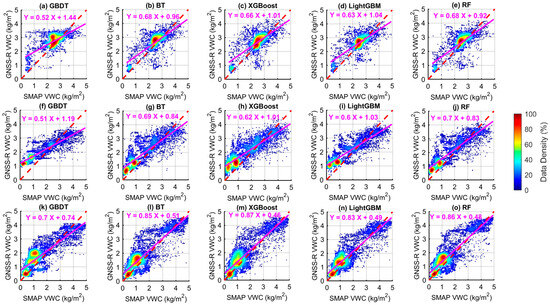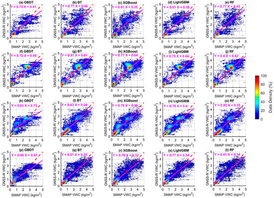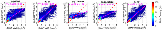 Scatter density plots for the retrieval of VWC and SMAP VWC using five models: (a) GBDT; (b) BT; (c) XGBoost; (d) LightGBM; (e) RF.