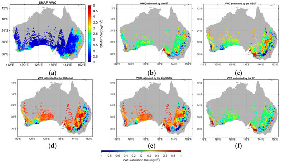 SMAP VWC (a) and the distribution of local bias (Australia) between SMAP VWC and the estimated VWC of five models: (b) BT; (c) GBDT; (d) XGBoost; (e) LightGBM; (f) RF.