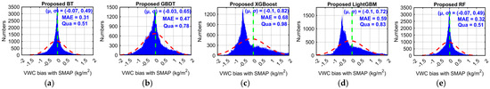 Histograms illustrating the distribution of discrepancies between SMAP VWC and VWC estimated by five models: (a) BT; (b) GBDT; (c) XGBoost; (d) LightGBM; (e) RF.