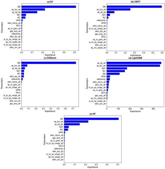 We analyzed the importance of each input feature for five models (i.e., BT, GBDT, XGBoost, RF, and LightGBM). Figure 7 shows the importance ranking of different input variables in estimating VWC. Obviously, we observed that the importance ranking of input variables was not exactly the same across these models, but overall, SM, longitude and latitude of specular point (SP), SST, RC, GPM, reflectivity, NBRCS, and LES are the most important parameters. It should be noted that the feature importance of LightGBM is calculated based on the splitting gain and can give a larger value, while for other models it is calculated based on the Gini coefficient. Therefore, only the importance of input features for the VWC estimation model is provided here.