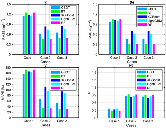 Performance evaluation of different parameter combination strategies (three schemes) on five models (GBDT, BT, XGBoost, LightGBM, and RF). (a) RMSE; (b) MAE; (c) MAPE; (d) R.