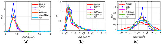 Figure 4 shows that the correlation between the VWC retrieved by the BT model and RF model method and the SMAP VWC is relatively superior to that of the other three models. The BT model and RF model method exhibit the highest degree of concentration near the 1:1 reference line (e.g., ). This suggests that the BT model and RF model achieve relatively good performance in retrieving local VWC, and the performance ranking of these models are BT > RF > GBDT > LightGBM > XGBoost. Additionally, compared with SMAP ancillary VWC data, XGBoost, LightGBM, and GBDT models have narrower dynamic ranges and weaker correlations for certain VWC values. The main reason is that in integrated ML, different models often have different hyperparameters, and the setting of these hyperparameters can affect the complexity, generalization ability, and performance of the model. Therefore, XGBoost, LightGBM, and GBDT models may have limited predictive ability for VWC values. The VWC retrieval performances of the BT model and RF model are consistently similar, with only a 1.75% difference in MAPE. It can be observed from Table 4 that the BT model and RF model exhibit better accuracy compared to the XGBoost, LightGBM, and GBDT models: in terms of RMSE, this is improved by 70.00%, 52.00%, and 32.00%, respectively; in terms of MAE, this is improved by 121.88%, 93.75%, and 46.88%, respectively, in terms of MAPE, this is improved by 200.95%, 176.99%, and 67.57%, respectively; and in terms of R value, this is improved by 14.29%, 6.59%, and 7.69%, respectively.