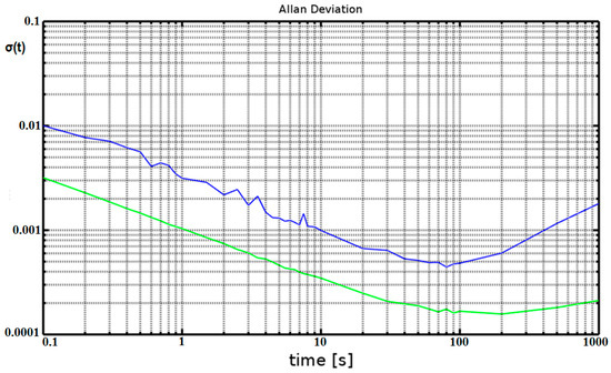 Accelerometer Allan variance log–log plots of MEMS IMU array (green) vs. single MEMS IMU (blue) [8].