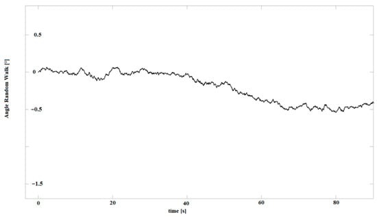 The velocity, or angular random walk (ARW), is a measure of accelerometer and gyro perturbation by some thermo-mechanical noise, which fluctuates at a rate much greater than the sampling rate of the sensor. This is proportional to the square root of the integration time [5], as presented in Figure 2 for stationary measurements, where the bias error changes with time. The uncertainty of the random walk increases with time, making it a non-stationary process. However, it can be considered stationary within small time intervals [13].