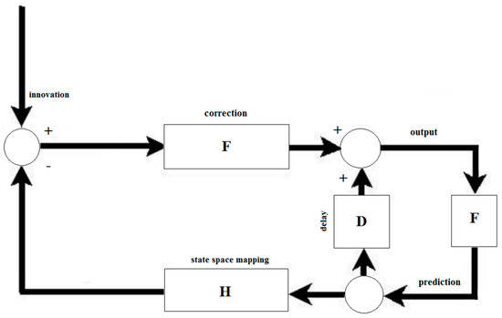 Integrating navigation information involves primarily using Kalman optimal filtering due to the nature of the Kalman filter [23,24,25,26,27,28], as presented in Figure 3. The measurement (innovation) is confronted with the processed measurement from the previous cycle. The cycle or iteration is presented using a feedback loop D (delay); thus, the filtering is essentially the integration of information, as presented in Figure 3 [26].