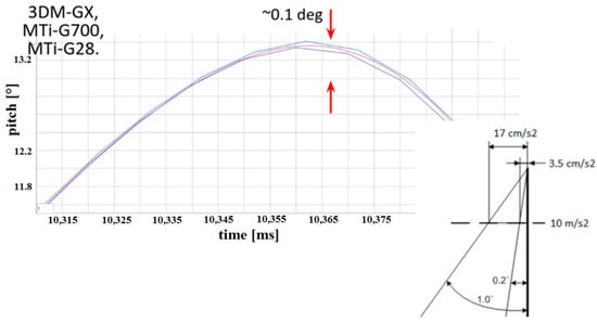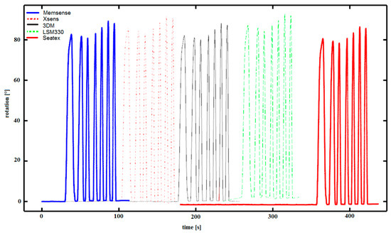 This is due to the fact that each device has a different initial error affecting the accelerometer measurements, i.e., when tilted, as in Figure 5, we obtain different initial readings. Figure 5 shows the devices for which simultaneous tilts were performed, i.e., for the Memsense MX IMU (Memsense, Rapid City, SD, USA) [29], Xsens MTi-G-28A53G35 (Xsens, Enschede, The Netherlands) [30] MicroStrain 3DM-GX3-25 (MicroStrain, Williston, ND, USA) [31], and LSM330 IMU (Samsung phone) (STMicroelectronics, Geneva, Switzerland) [32], but also for the high-precision Seatex MRU IMU-5 Kongsberg (Seatex, Rosenberg, TX, USA) [33]; the differences are obvious, as presented in Figure 6.