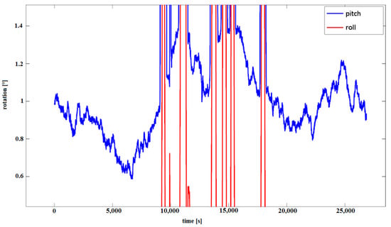 The errors of acceleration may be small, i.e., of the order of 0.001 G; however, they can unfortunately have a significant impact on dead reckoning measurements using the IMU because small differences in tilt measurement result in large errors. Therefore, the tilt measured is similar for all sensors, but there are differences in the shift from the ordinate level to 0, as shown in Figure 6. The actual measurements, as presented in Figure 6, show differences in readings from different IMUs, and even small errors in the tilt IMU measurement have serious consequences in the context of inertial navigation. Figure 7 presents pitch and roll measurements from Xsens MTi-G-28A53G35 using a Kalman filter, and Figure 8 presents the same measurements enlarged for pitch measurements. Despite the use of the Kalman filter, the measurements of pitch are not stable and differ significantly, even in static conditions.