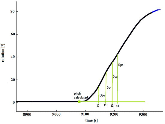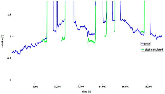 The green line (pitch) presents the results of pitch measurements using the proposed algorithm (see Figure 14); the figure presents the results of the estimated pitch using Kalman (blue) and pitch calculated using the proposed algorithm (green).
