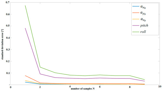 As can be easily seen in Figure 11, as the number of measurements N increases, i.e., the number of equations in Equation (22), the accuracy of pitch, roll, and bias error (,, , ) measurements improves. This is a positive effect that characterizes the LSQ approach.
