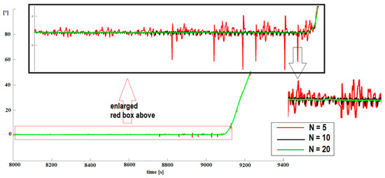 The application of the proposed algorithm to real data from MEMS Xsens MTi-G-28A53G35 confirms the simulations performed. Figure 12 shows the effect of using the algorithm described in Section 4.1 for different N = 2 (green), N = 10 (black), and N = 20 (green). The green figures give the best results and confirm the simulations. Figure 12 presents pitch measurements for different N. Quality improves as N increases (real records).