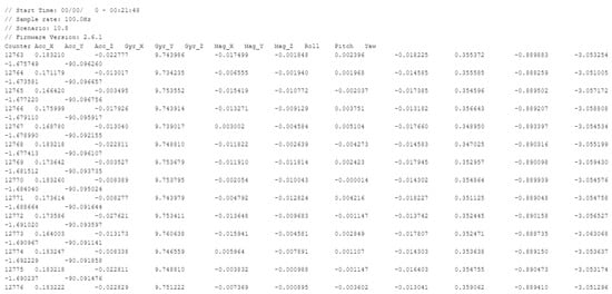 Record samples from the Xsens MEMS MTi-G-28A53G35 are presented in Figure 13. Columns 2–4 are the accelerometer measurements, columns 5–7 are the gyro angular rate (AR), and columns 10–12 are the roll, pitch, and yaw. The last columns are the result or output of the EKF filter implemented in this device [16].