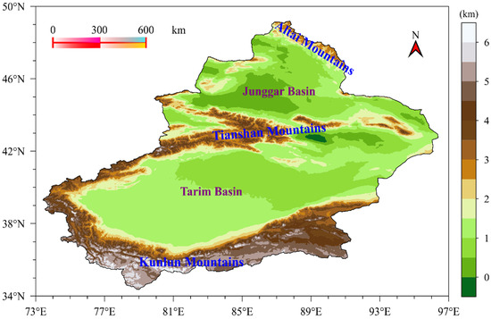 Xinjiang, China (XJ) is located in the northwest of China and belongs to a typical arid climate region, and the region is far from the ocean and has relatively sparse precipitation [25,52,53]. From north to south, XJ has a topographic distribution pattern of alternating mountains and basins, that is, the Junggar Basin and Tarim Basin are distributed between the Altai Mountains, Tianshan Mountains, and Kunlun Mountains, as shown Figure 1.