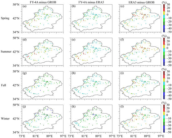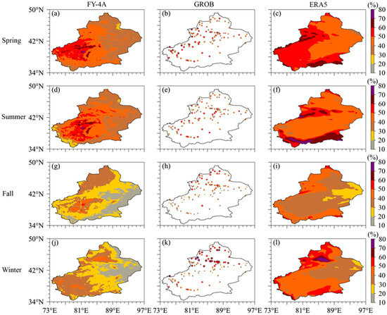 The seasonal variation in the spatial distribution of the difference in TCC frequency among FY-4A, GROB, and ERA5 is shown in Figure 4. The difference in TCC frequency between FY-4A and GROB (the former minus the latter, the same below) was greater (less) than 0 in most NMSs in southern (northern) XJ in spring, and the difference between the two was concentrated between −30% (0) and 0 (20%) in the northern Junggar Basin (western Tarim Basin) (Figure 4a). The difference in TCC frequency between FY-4A and GROB in summer was similar to that in spring (Figure 4d). The difference in TCC frequency between FY-4A and GROB was obviously different between fall and summer. Specifically, the deviation of most NMSs in the Junggar Basin (Tarim Basin) was between −30% (−20) and −10% (10%) in fall (Figure 4g). The difference in TCC frequency between FY-4A and GROB was most obvious in the Junggar Basin in winter, reaching −40% (Figure 4j).