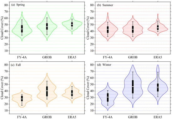 The violin plot of the seasonal variation in TCC frequencies (%) from FY-4A, GROB, and ERA5 at 105 NMSs in XJ, showing the mean (white line), median (white dot), interquartile range (rectangle), the 5th and 95th percentiles (whiskers), and the kernel density estimation (translucent shadow).