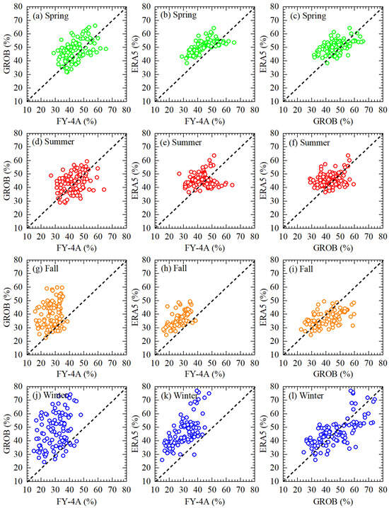Scatterplot of the seasonal variation in TCC frequencies (%) from FY-4A, GROB, and ERA5 at 105 NMSs in XJ. TCC frequencies from GROB versus those from FY-4A in (a) spring, (d) summer, (g) fall, and (j) winter, TCC frequencies from ERA5 versus those from FY-4A in (b) spring, (e) summer, (h) fall, and (k) winter, and TCC frequencies from ERA5 versus those from GROB in (c) spring, (f) summer, (i) fall, and (l) winter. The black dashed line represents the 1:1 relation.