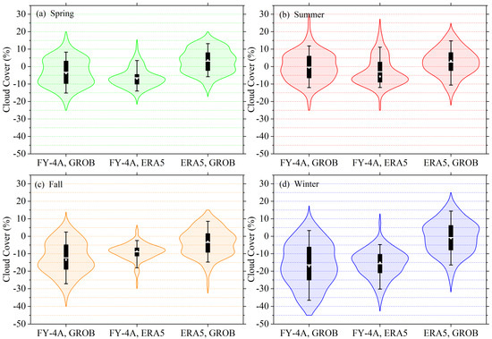 The violin plot of the seasonal variation in the difference in TCC frequency among FY-4A, GROB, and ERA5 at 105 NMSs in XJ is shown in Figure 6. In spring, the difference in TCC frequency between FY-4A and GROB (the former minus the latter, the same below) was mainly concentrated between −13% and 7%, with an average deviation of −3.23%. Approximately 86% of NMSs in XJ had a difference of −13–3% between FY-4A and ERA5, with an average difference of −6.40% in spring. The difference between ERA5 and OBS was mainly concentrated in −5–10%, with a deviation of −2–8% for half of NMSs, and an average deviation of 3.17% in spring (Figure 6a). In summer, the difference in TCC frequency between FY-4A and GROB was mainly concentrated in the range of −10–9%, and the number of NMSs with a deviation above 0 was almost equivalent to the number of NMSs with a deviation below 0, with an average deviation of −0.03%. The difference in TCC frequency between FY-4A and ERA5 was mainly concentrated between −12% and −2% in summer, with an average deviation of −2.93%, and the range of deviation was significantly larger than that in spring. The difference in TCC frequency between ERA5 and OBS in summer was mainly concentrated at −5–10%, similar to spring, with a deviation of −2–8% for half of NMSs and an average deviation of 2.64% (Figure 6b). In fall, the difference in TCC frequency between FY-4A and OBS was mainly concentrated between −23% and 0%. The number of NMSs with a deviation less than 0 accounted for 89% of the total number of NMSs, which was significantly higher than that in spring and summer. The average deviation was −12.33% in fall, and the deviation amplitude was significantly larger than that in spring and summer. The difference in TCC frequency between FY-4A and ERA5 was mainly concentrated between −15% and −2% in fall, accounting for about 89% of NMSs. The average deviation was −8.86%, and the deviation range was significantly smaller than that in summer. The difference in TCC frequency between ERA5 and OBS was mainly concentrated between −12% and 5% in fall, with a deviation of −9–2% for half of NMSs. Unlike spring and summer, in fall, more than half of NMSs had a deviation of less than 0 (Figure 6c). In winter, the difference in TCC frequency between FY-4A and OBS was mainly concentrated between −30% and 0%, with NMSs with deviation amplitude exceeding 10% accounting for 65% of the total NMSs. The average deviation was −16.35%, and the range and amplitude of deviation were the largest in the four seasons. The difference in TCC frequency between FY-4A and ERA5 was mainly concentrated between −25% and −5% in winter, accounting for about 82% of NMSs. The average deviation was −15.67%, and the amplitude of the deviation was the largest in the four seasons. The difference in TCC frequency between ERA5 and GROB was mainly concentrated between −10% and 8% in winter, with an average and median deviation of about 0 (Figure 6d).