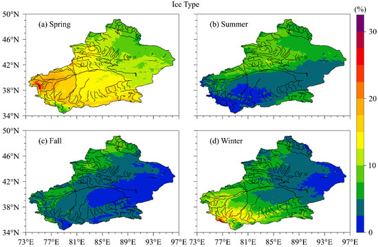 Figure 11 shows the seasonal variation in the spatial distribution of ice-type frequency in XJ. In spring, the frequency of ice-type was high in the southwest and low in the northeast. The western Kunlun Mountains was a high-frequency center of more than 25%, while the eastern Junggar Basin was a low-frequency area of less than 10% (Figure 11a). The frequency distribution of ice-type in summer was significantly different from that in spring, with a distribution pattern of high in the north and low in the south in summer (Figure 11b). The frequency distribution of ice-type showed a characteristic of high in the northwest and low in the southeast in fall, with over 5% (less than 2.5%) in the northwest (southeast) of XJ (Figure 11c). The frequency distribution of ice-type showed a characteristic of high in the southwest and low in the northeast in winter, with the western Kunlun Mountains (eastern XJ) being a high-frequency (low-frequency) region of over 15% (less than 5%) (Figure 11d).