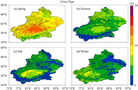 Figure 12 shows the seasonal variation in the spatial distribution of cirrus-type frequency in XJ. In spring, the frequency of cirrus-type was the highest in the Tarim Basin, reaching more than 10%, while the Kunlun Mountains and the eastern Junggar Basin were low-frequency regions below 7.5% (Figure 12a). Compared to spring, the frequency of cirrus-type significantly decreased throughout XJ in summer (Figure 12b). In fall, the most cirrus-type appeared in the Tarim Basin, which was a high-frequency area of more than 5%, while the least cirrus-type appeared in the Kunlun Mountains, Altai Mountains, and eastern Xinjiang, which was a low-frequency area of less than 2.5% (Figure 12c). In winter, the frequency of cirrus-type in XJ was high in the southwest and low in the northeast. The Tarim Basin had a high-frequency area of more than 5%, while eastern Xinjiang had a low-frequency area of less than 2.5% (Figure 12d).