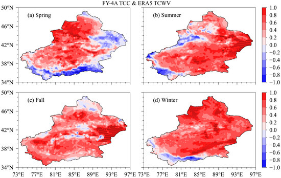 The seasonal variation in the spatial distribution of the correlation between TCC based on FY-4A and TCWV based on ERA5 from March 2018 to February 2023 based on monthly average data in XJ. Regions that pass the significance test with 95% confidence (p < 0.05) are displayed as black dots, the same below.