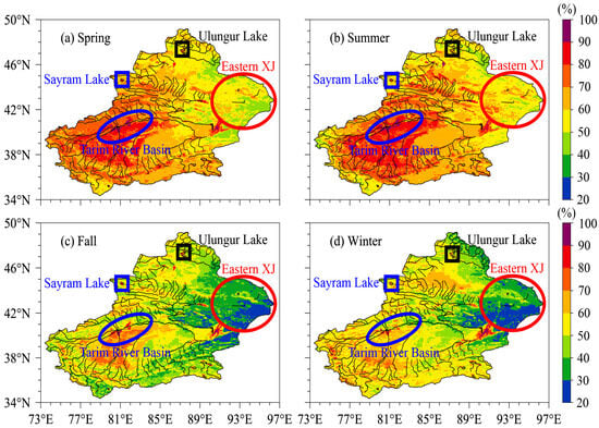 The seasonal variation in the spatial distribution of cloud frequency in XJ. The blue and black rectangles, as well as the blue and red ellipses, represent Sayram Lake, Ulungur Lake, Tarim River Basin, and eastern XJ, respectively.