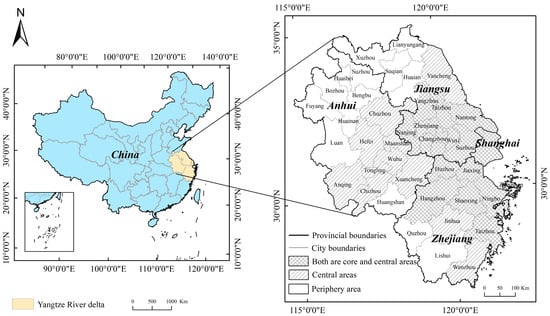 The study area of the Yangtze River Delta includes 41 cities across Jiangsu, Zhejiang, Anhui provinces, and Shanghai Municipality. The administrative boundaries for these provinces and cities were obtained from the National Geomatics Center of China (https://www.ngcc.cn, accessed on 11 June 2023). The geographic coordinate system and projection coordinate system of these data are consistent with those of the nightlight data.