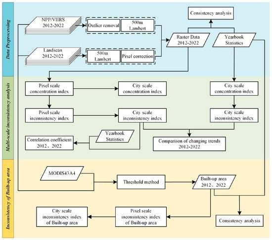 The experimental workflow of this study is illustrated in Figure 2. First, we standardized the spatial resolution of nighttime light and population raster data from 2012 to 2022 and validated the suitability of raster data as a substitute for statistical data. Next, we calculated multi-scale geographic concentration and inconsistency indices for both nighttime light and Landscan data at pixel and city scales. We compared the 10-year trends in inconsistency indices derived from nighttime light data with those obtained from statistical data and examined the impact of various social factors on these trends. Finally, we extracted pixel-scale inconsistency indices for built-up areas in 2012 and 2022 to perform a quantitative analysis of the coupling changes between population and economic activities within cities.