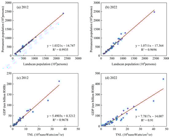 Figure 3. Scatter plots of 41 cities for the Yangtze River Delta for NPP/VIIRS vs. GDP in 2012 (a) and 2022 (b) and for Landscan vs. resident population in 2012 (c) and 2022 (d).