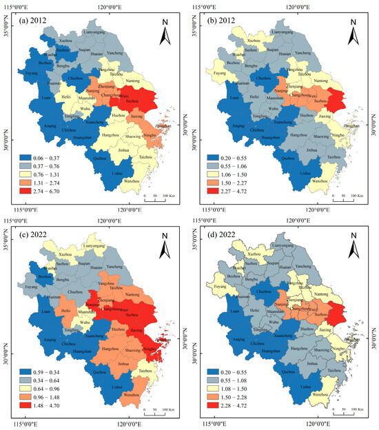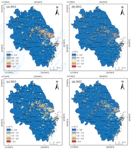 Figure 4. 2012–2022 spatial patterns of population and nightlight geographic concentration at the pixel scale in the Yangtze River Delta region: (a) nightlight geographic concentration in 2012, (b) population geographic concentration in 2012, (c) nightlight geographic concentration in 2022, (d) population geographic concentration in 2022.