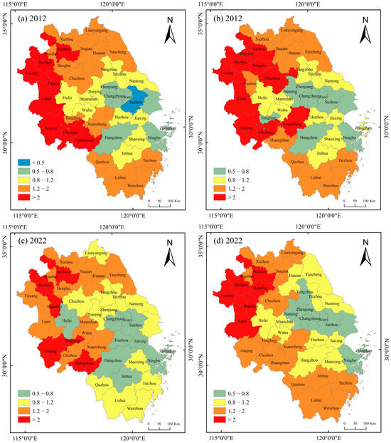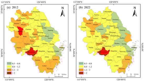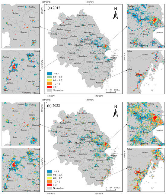 The population–nighttime light inconsistency index were computed for urban area pixel scales in 2012 and 2022 (Figure 8). The results reveal that in most cities, the central urban regions exhibit significantly higher population concentration compared to nighttime light intensity (I > 2). Slightly farther from the city centers, there is a tendency toward a more coordinated aggregation of population and economy (0.8 < I < 1.2), while the outer areas of the cities mostly display lower population concentration compared to nighttime light intensity (I < 0.5). This inconsistency is notably evident in highly urbanized cities such as Shanghai, Suzhou, Nanjing, Wuxi, Hefei, and Hangzhou, where urbanization rates exceed 80%.