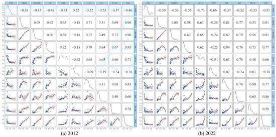 Political effects, market mechanisms, spatial industrial linkages, and transportation networks exert a crucial influence on the development of urban agglomerations [61]. Changes in population and economy are often associated with socio-economic variables such as market mechanisms, employment, transportation, and investment. Therefore, this study collected various statistical parameters from cities in the Yangtze River Delta (YRD) region based on Table 1, including fixed investments, income and employment, industry, resources, transportation, and education—11 categories in total. The data were standardized and normalized. Due to the limited spatial resolution of the statistical data, the loess regression method in R was used to fit the 11 parameters to the city-scale population–nightlight inconsistency index (PNII) derived from raster data, calculating the correlation coefficients. This approach aimed to identify the key social factors leading to inconsistent changes in population and economy across YRD cities. The parameters with absolute correlation coefficients greater than 0.3 for the years 2012 and 2022 are shown in Figure 7.