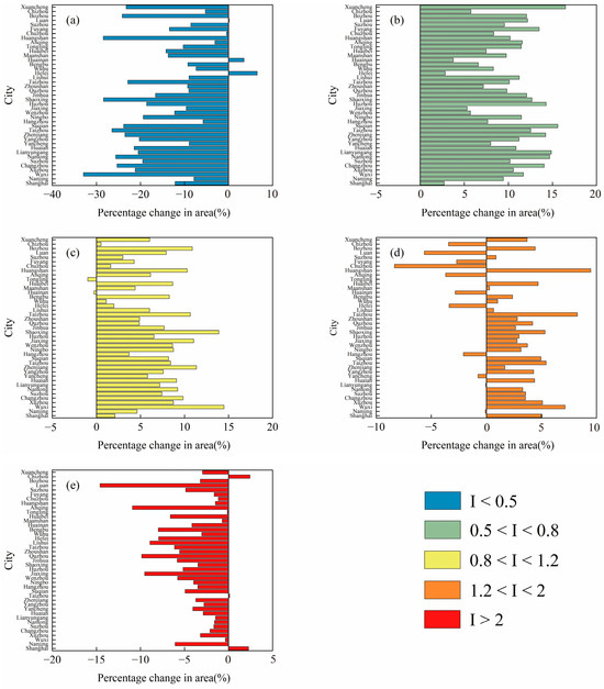 Figure 9. Illustrates the changes in the proportion of land area with different degrees of inconsistency between population and nighttime light intensity in the urban areas of the Yangtze River Delta from 2012 to 2022. Subfigures are categorized as follows: (a) population concentration significantly lower than nighttime light concentration (I < 0.5), (b) population concentration slightly lower than nighttime light concentration (0.5 < I < 0.8), (c) coordinated concentration of population and economy (0.8 < I < 1.2), (d) population concentration slightly higher than nighttime light concentration (1.2 < I < 2), (e) population concentration significantly higher than nighttime light concentration (I > 2).
